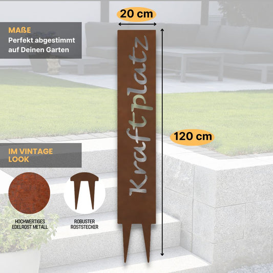 "Kraftplatz" Gartenstecker aus Metall in Edelrostoptik