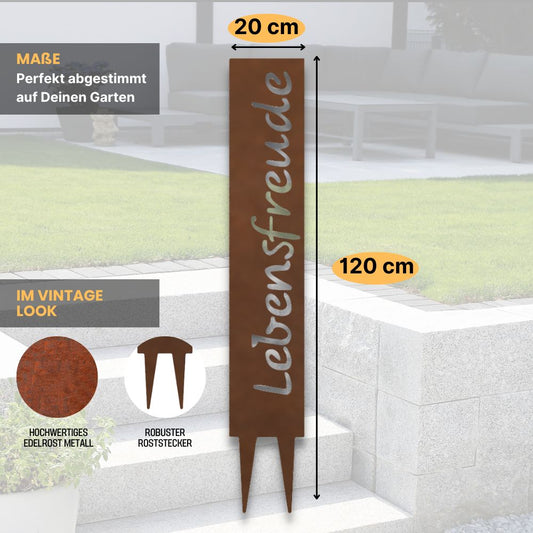 "Lebensfreude" Gartenstecker aus Metall in Edelrostoptik