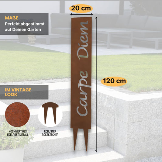 "Carpe Diem" Gartenstecker aus Metall in Edelrostoptik