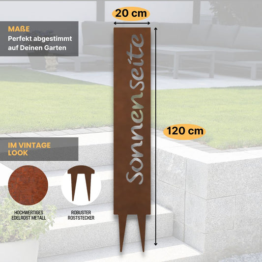 "Sonnenseite" Gartenstecker aus Metall in Edelrostoptik