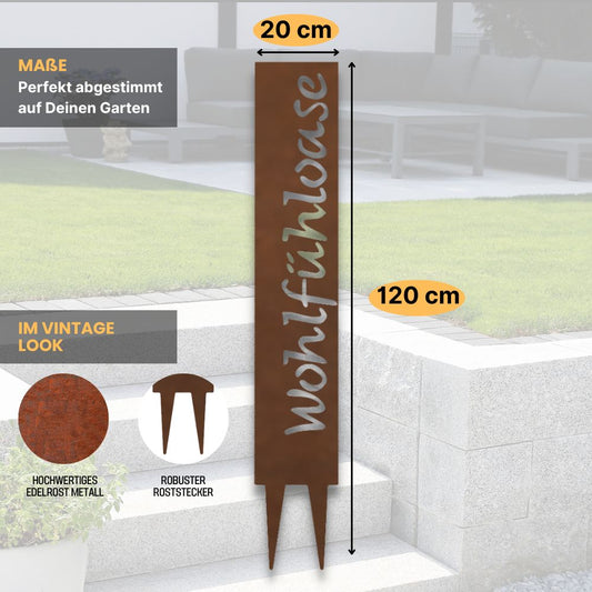 "Wohlfühloase" Gartenstecker aus Metall in Edelrostoptik – Wetterfestes Gartenschild – Stilvolle Gartendekoration im Vintage-Look