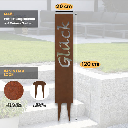 "Glück" Gartenstecker aus Metall in Edelrostoptik
